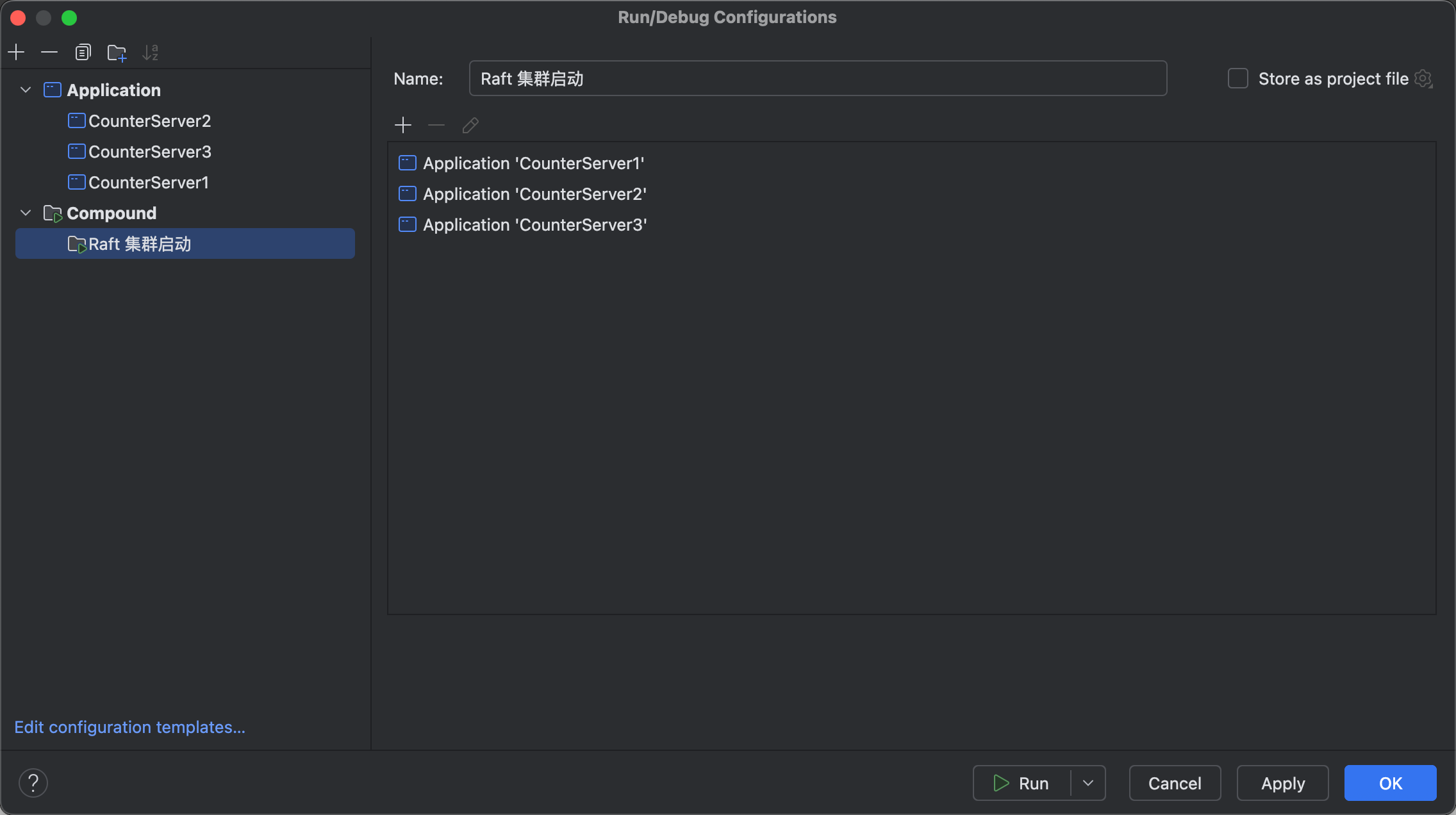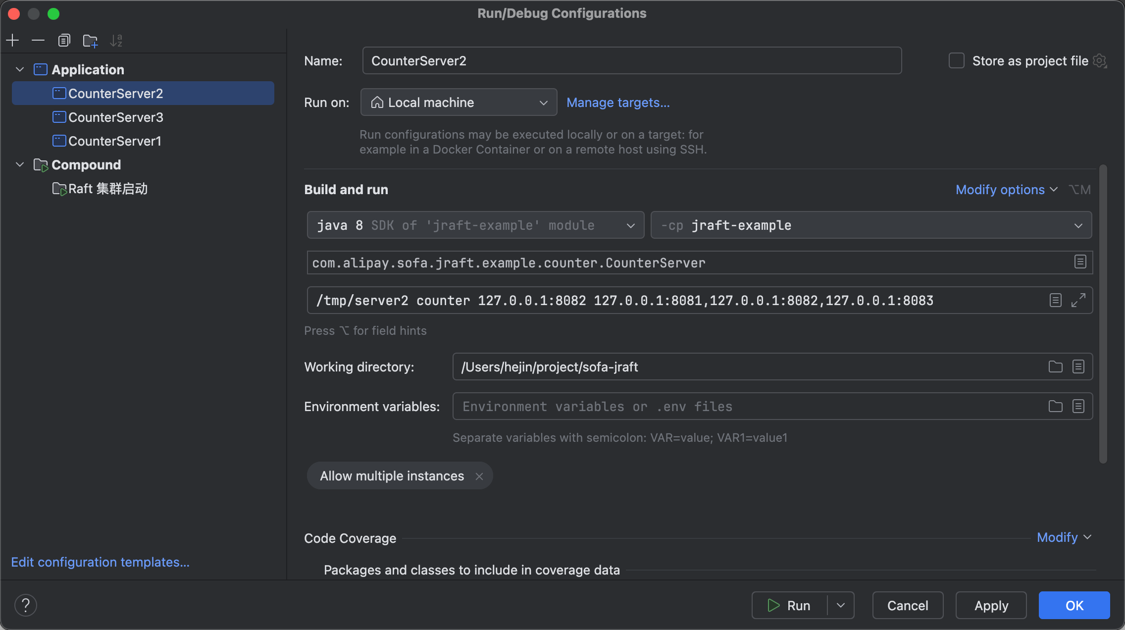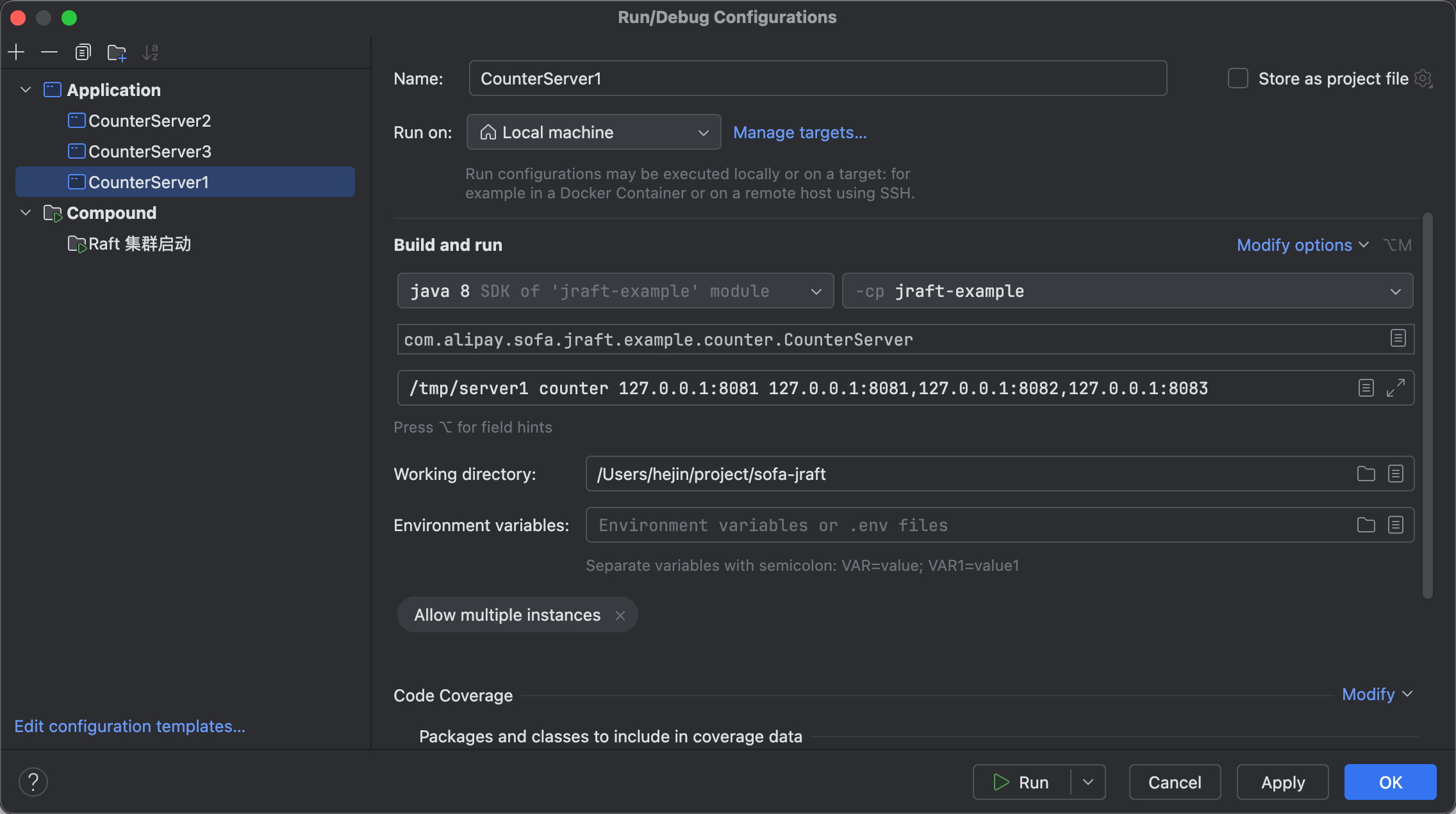 在 JRaft 的 Example 中,有一个计数 Counter 的例子,需要启动三个 Raft 节点构成集群,可以在 Idea 进行如下配置快速启动: